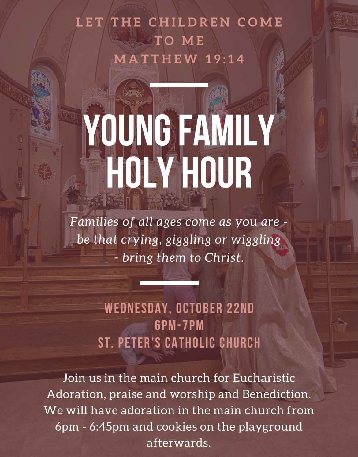 Once per quarter, we organize a time for families, including those with littles to come Worship, just as they are. Eucharistic Adoration, praise and worship, Benediction. Families of all ages, come as you are, crying giggling or wiggling-bring them to Christ. Adoration in the main church from 6pm-6:30pm with treats on the playground afterwards.