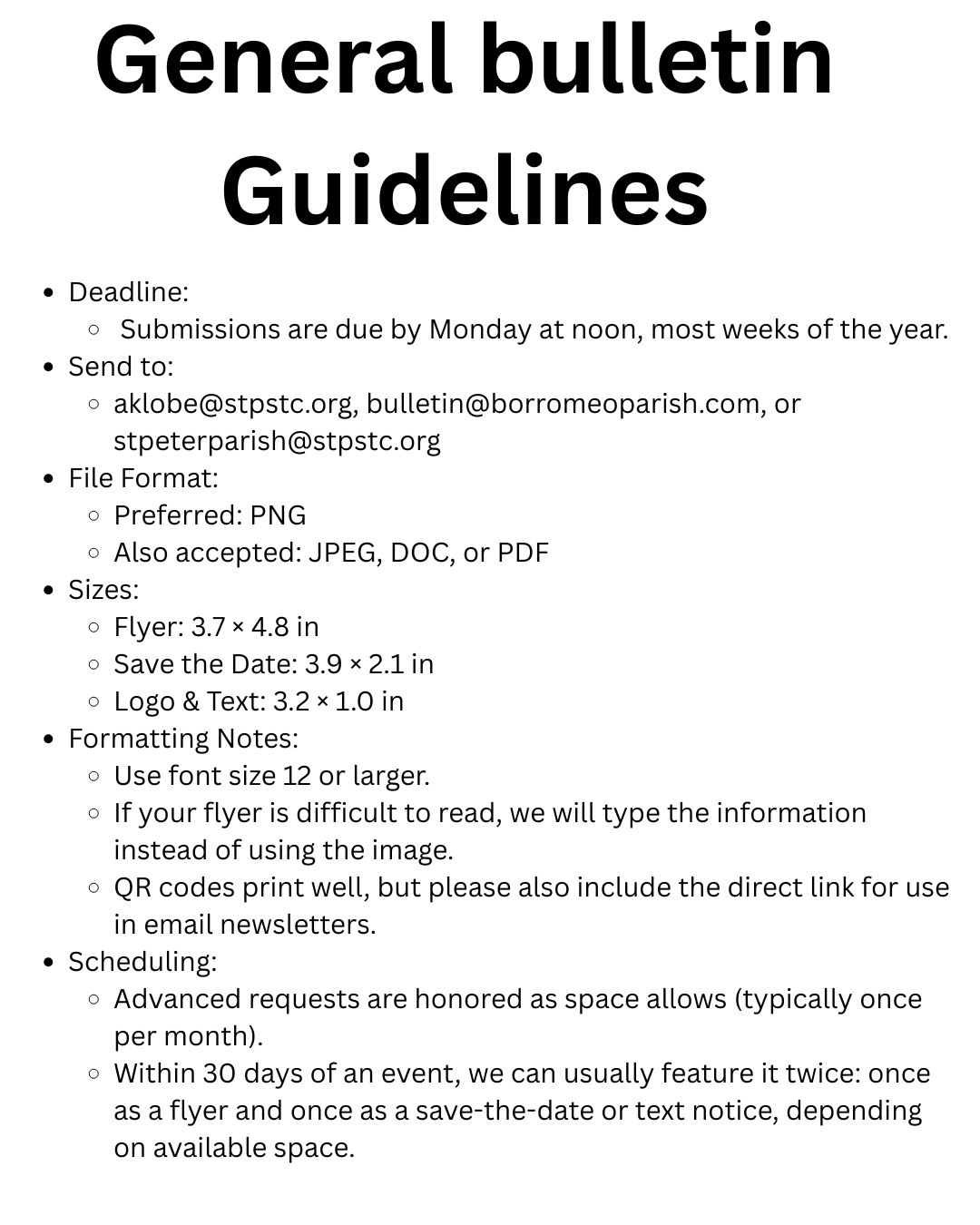 Bulletin Submission details: EMAIL: StPeterParish@stpstc.org or Aklobe@stpstc.org.