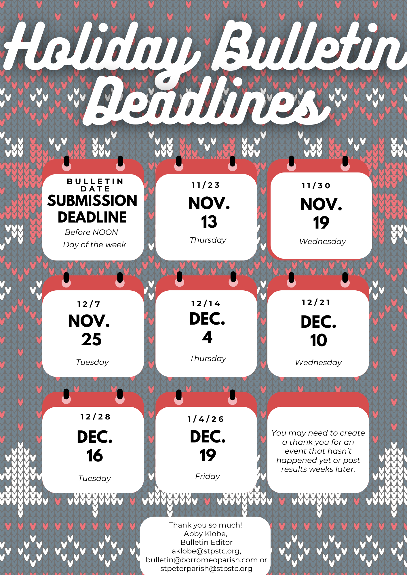 Around holidays, Holy Week, and during the months of November and December, bulletin submissions will be much earlier than planned. This may require forethought.