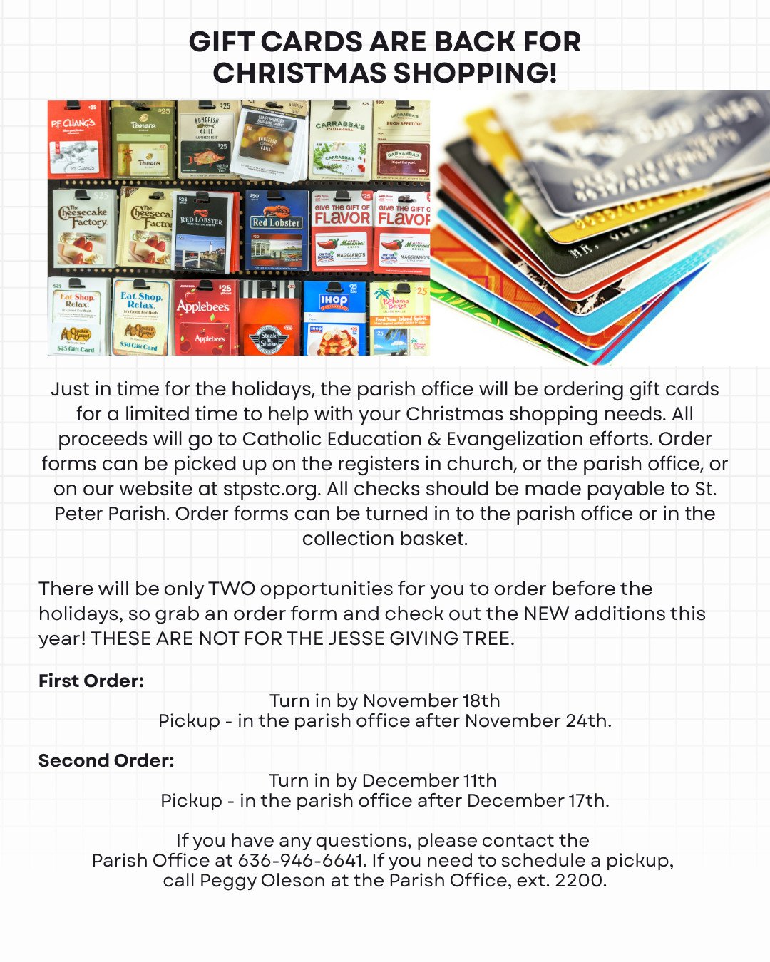 Gift Card orders due Nov. 18 or Dec. 11. Order form is attached below.