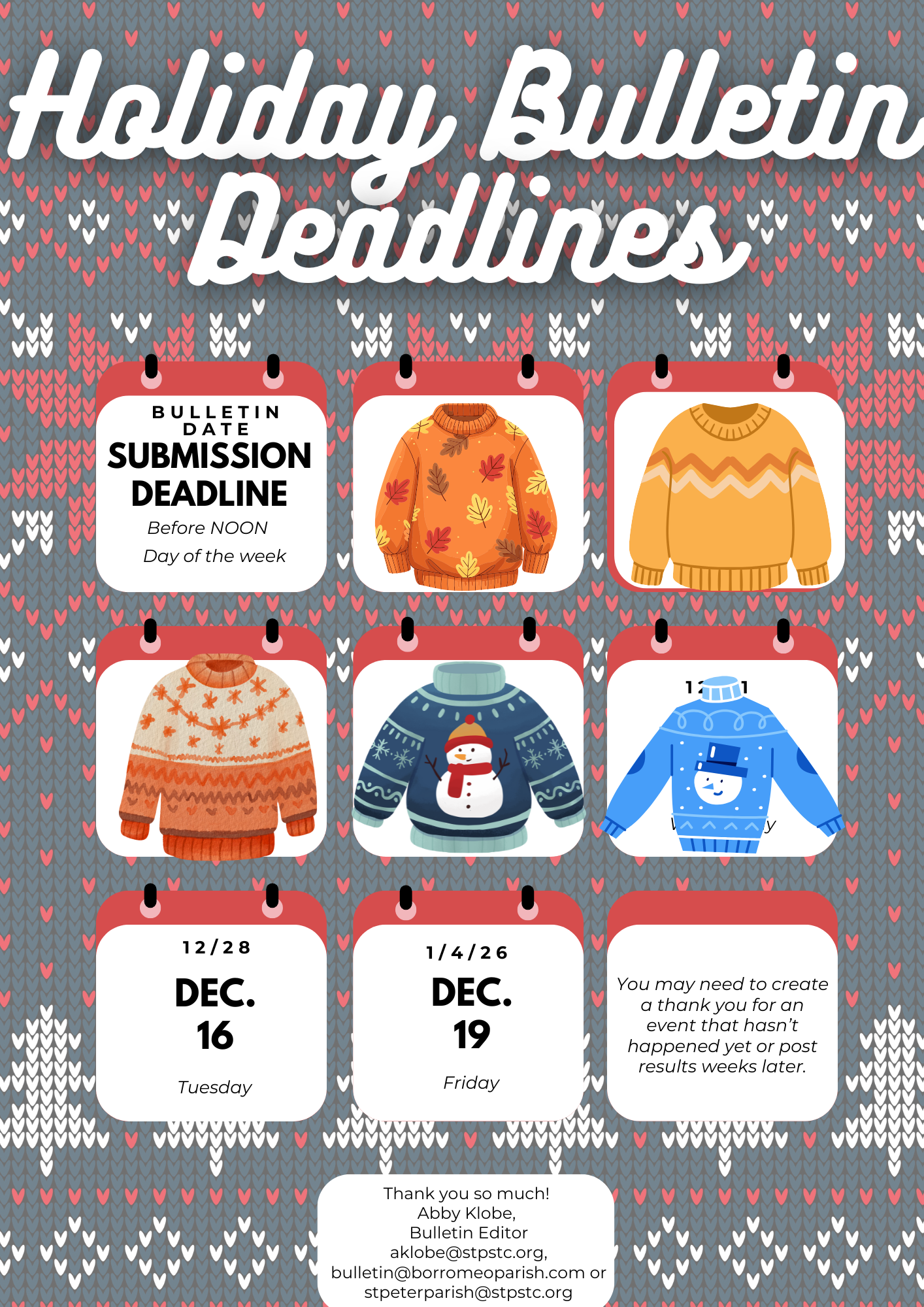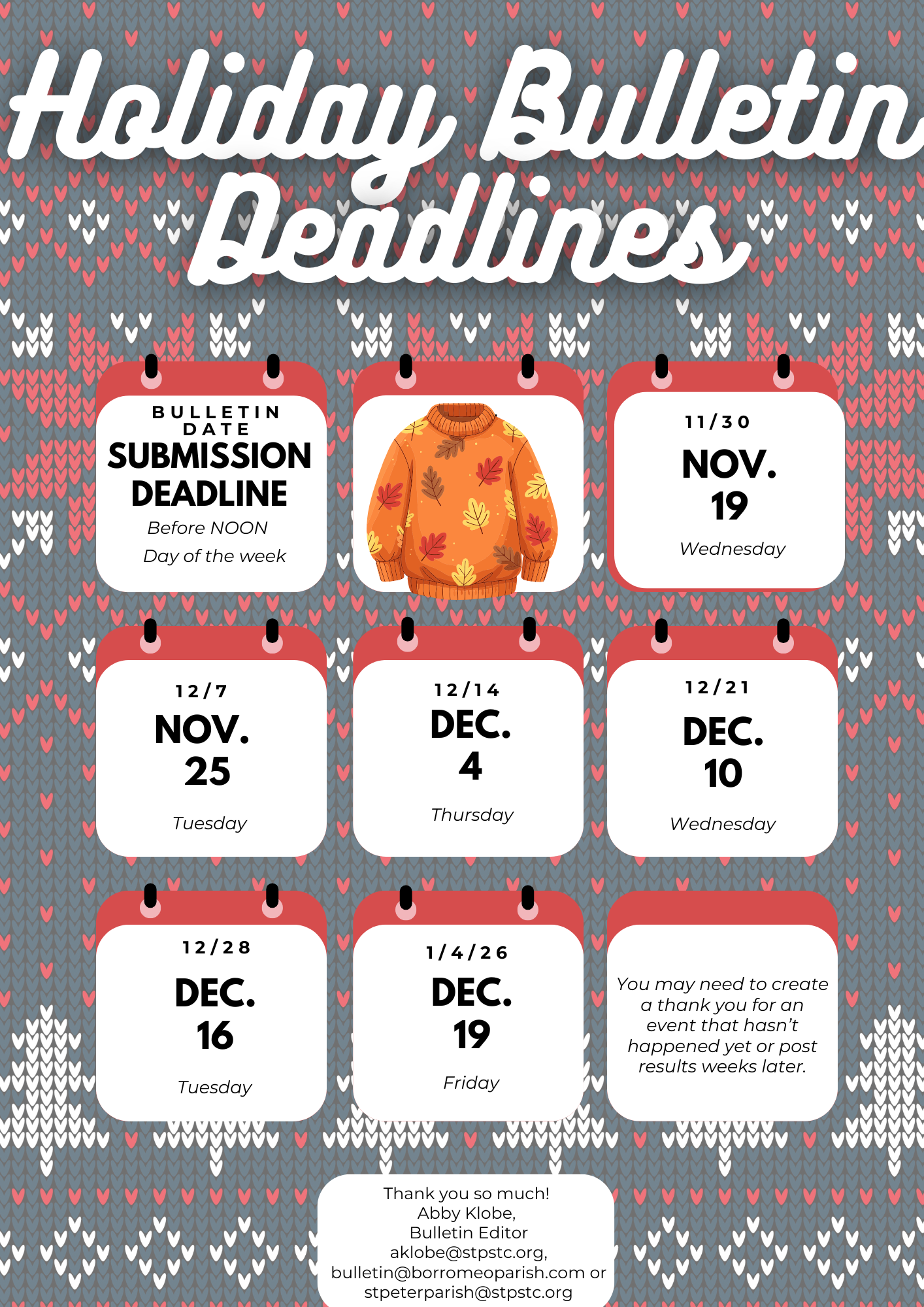 All the remaining bulletins this calendar year and the first bulletin of 2026 have early deadlines. Each box should contain the pertinent info. If you would like to put something in the bulletin that comes out Sunday, November 30th, it must be emailed or dropped off by noon on Wednesday, November 19th.