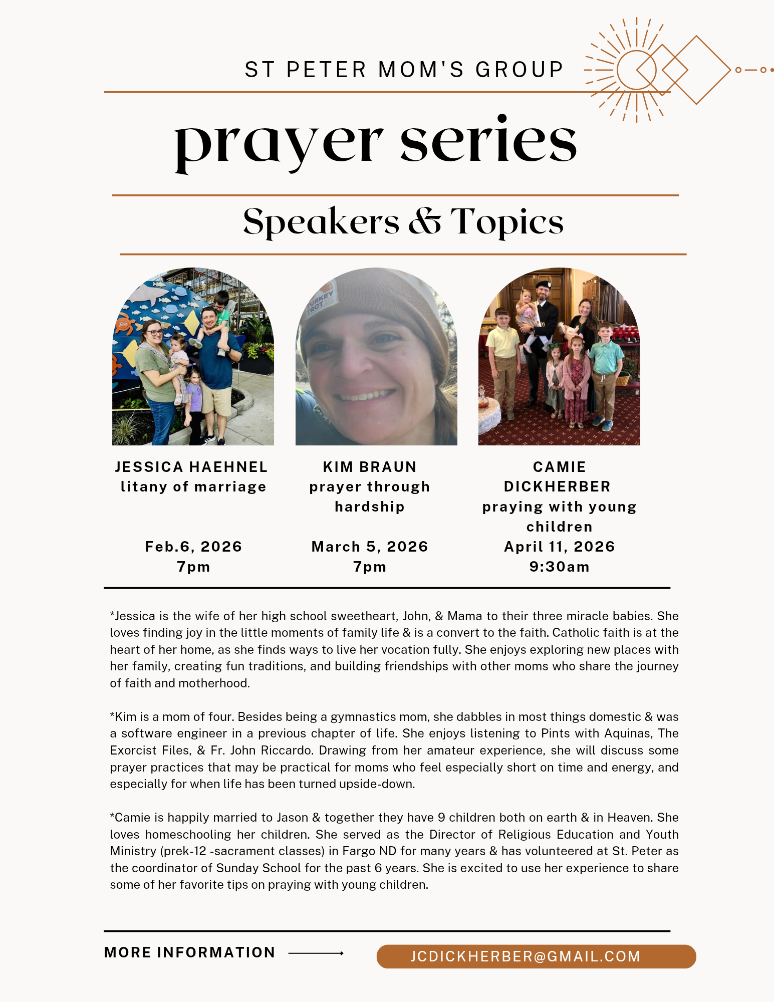 Mom's Group meets on Feb. 6th, Mar. 5, and Apr. 11. All are welcome to join. Email jcdickherber@gmail.com for location and questions.