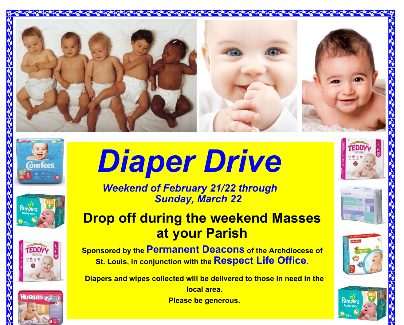During the weekends of February 21/22 through Sunday, March 22, the Permanent Deacons and in the Archdiocese of St. Louis, in conjunction with the Respect Life office, will be collecting diapers for infants, toddlers and adults as part of our eleventh annual diocesan-wide Pro-Life service project to assist families in need.
